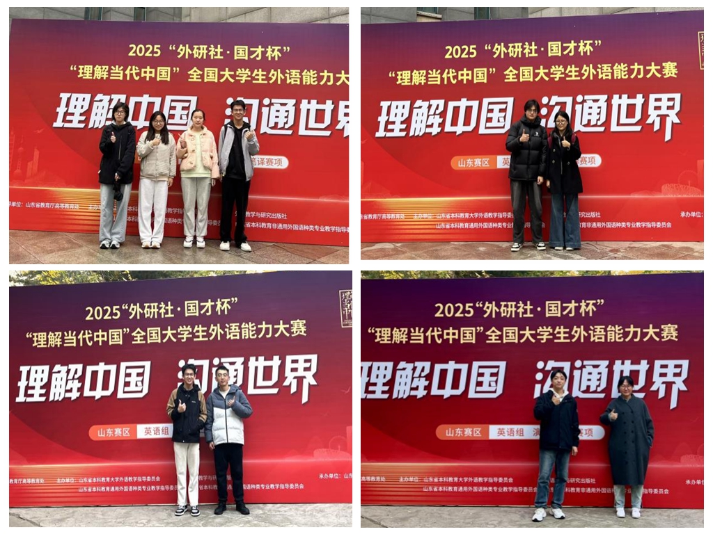 11月1日至9日,2025“外研社·国才杯”“理解当代中国”全国大学生外语能力大赛山东省决赛陆续举办,我校参赛的13名学生获铜奖7项,其中演讲赛项铜奖1项、综合能力赛项铜奖3项、笔译赛项铜奖2项、短视频赛项铜奖1项。人文学院教师王婧、隋艺绮、李倩倩获“优秀指导教师奖”。