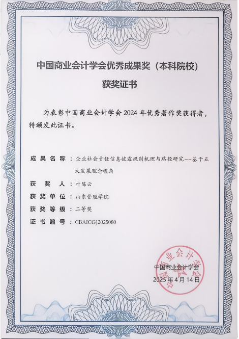 4月3日,中国商业会计学会正式公布2024年度优秀著作评选结果,我校叶陈云教授独著的学术专著《企业社会责任信息披露规制机理与路径研究——基于五大发展理念视角》,凭借其理论深度与实践价值,从全国数百项参评成果中脱颖而出,荣获全国本科院校组优秀著作奖二等奖。