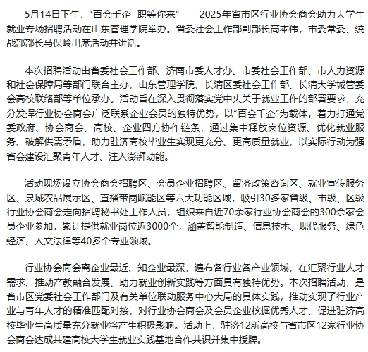 下一条:【山东社会工作】“百会千企 职等你来”——2025年省市区行业协会商会助力大学生就业专场招聘活动举办