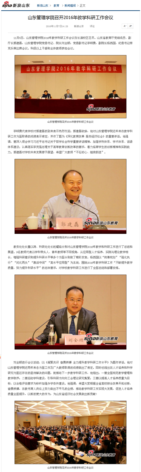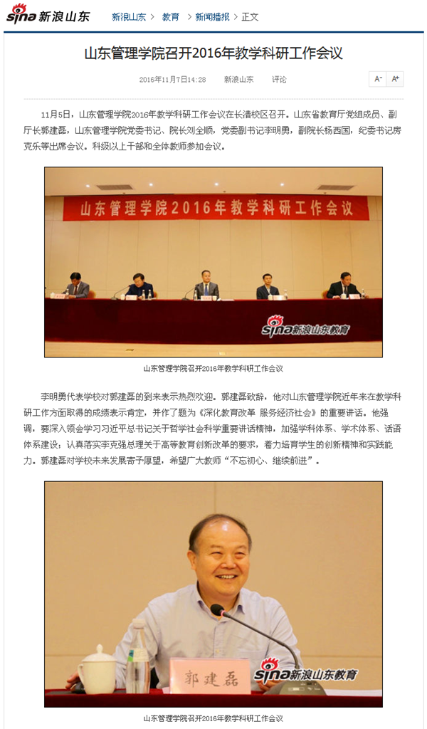 11月5日,米兰体育官方网站首页入口2016年教学科研工作会议在长清校区召开。省教育厅党组成员、副厅长郭建磊,米兰体育官方网站首页入口党委书记、院长刘全顺,党委副书记李明勇,副院长杨西国,纪委书记房克乐等出席会议。