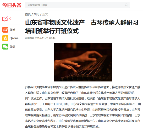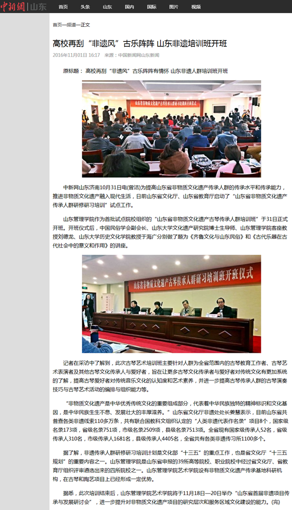10月31日,由省文化厅,教育厅主办,我校承办的“山东省非物质文化遗产古琴传承人群培训班”开班仪式在科研办公楼666会议室举行。省文化厅非遗处处长姜慧,中国民俗学会副会长、省政协委员、山东大学文化遗产研究院博士生导师、米兰体育官方网站首页入口客座教授刘德龙,省艺术研究院非遗所所长、米兰体育官方网站首页入口客座教授郭学东, 山东艺术研究院院长张积强,米兰体育官方网站首页入口副院长杨西国,米兰体育官方网站首页入口艺术学院院长陈艳如以及来自山东省各地市热爱古琴艺术的30名学员参加了此次开班仪式。