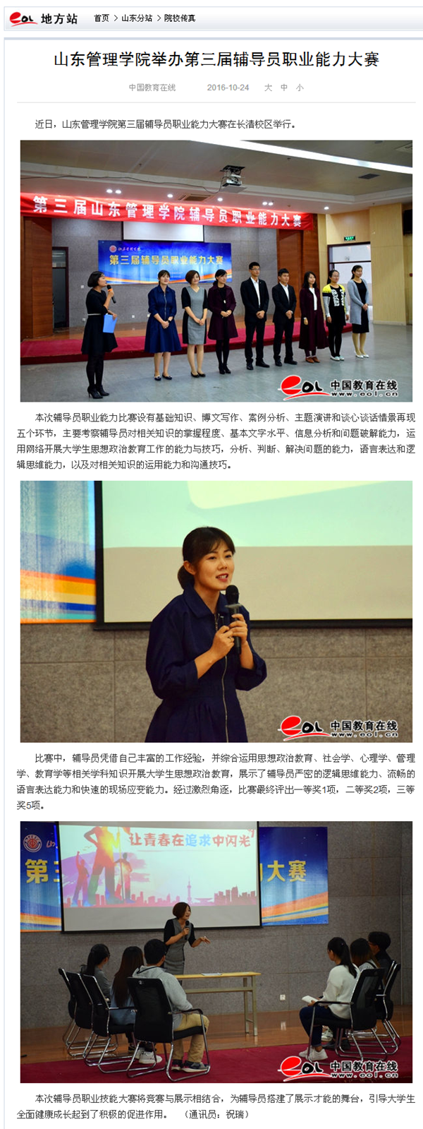 近日,米兰体育官方网站首页入口第三届辅导员职业能力大赛在长清校区举行,设有基础知识、博文写作、案例分析、主题演讲和谈心谈话情景再现五个环节。辅导员们在比赛中展示了严密的逻辑思维能力、流畅的语言表达能力和快速的现场应变能力。大赛将竞赛与展示相结合,为辅导员搭建了展示才能的舞台,引导大学生全面健康成长起到了积极的促进作用。
